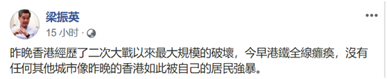 香港警方5日凌晨表示,严重暴力行为在短时间内迅速蔓延到全港14个区。一些商店被严重破坏,货物散落一地。有暴徒如劫匪一般撬开银行闸门,在里面纵火。更有大批暴徒围攻一名便衣警察,该警员因自卫而开了一枪,期间暴徒甚至试图抢枪。“昨晚香港经历了二次大战以来最大规模的破坏,今早港铁全线瘫痪,没有任何其他城市像昨晚的香港如此被自己的居民强暴。”香港前特首梁振英5日这样在社交账号上发帖感叹道。