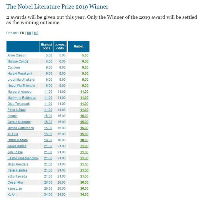 9月30日,Nicerodds发布了2019年的诺贝尔文学奖赔率名单,最大的一个变化是:出现了不少陌生的面孔,同时领跑者里面终于没有村上春树了。
