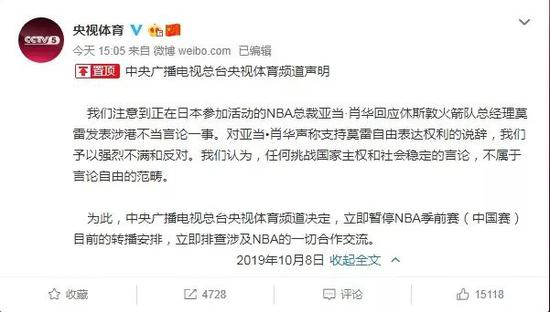 10月8日下午,中央广播电视总台央视体育频道发表声明称,立即暂停NBA季前赛(中国赛)目前的转播安排。
