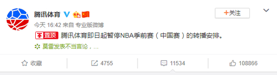 就在央视体育频道宣布暂停NBA转播后不久,10月8日下午,负责NBA在中国的网络转播的腾讯体育也宣布,暂停NBA季前赛(中国赛)的转播安排。这意味着,NBA在中国的电视转播和网络转播全部暂停。