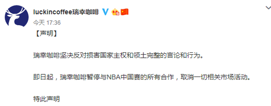 今天,还有vivo、瑞幸咖啡、安踏、蔡徐坤等公司或名人宣布暂停或停止与NBA合作。