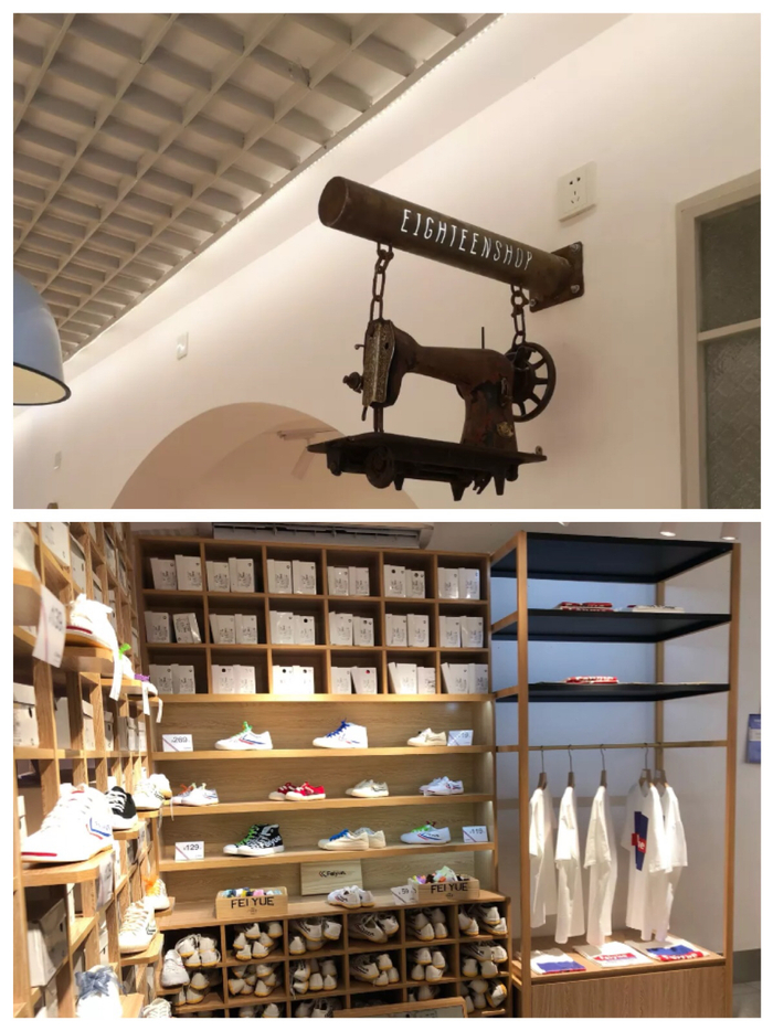 相比烟袋斜街的飞跃鞋店,在南锣鼓巷里的飞跃鞋店面积大、商品款式多。这家店里里外外有好几间屋子、好几面墙摆放着飞跃鞋。当然这里也有一些怀旧的元素,比如墙上悬挂着的旧缝纫机就相当惹眼。此外,南锣鼓巷里还有一家回力鞋店,让你可以一条路上打卡两家国产老牌球鞋。