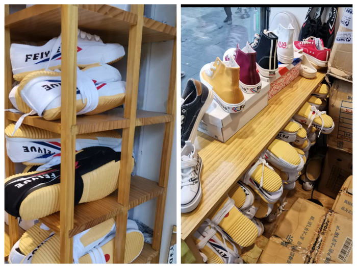 如果想找更多更全的飞跃鞋,可以去北京的胡同里转转。在烟袋斜街里有一家飞跃鞋店,面积不大,但款式不少。这家店非常传统,货架上鞋子的摆放方式充满怀旧味道。