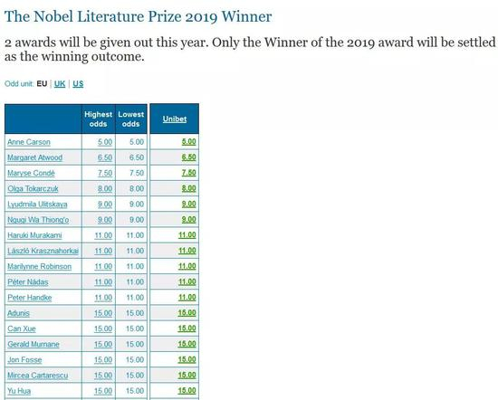 截至10月10日,在英国博彩公司NicerOdds发布的2019年诺贝尔文学奖赔率榜上,残雪排在第13位。最高排名时,她位列第三位。早在八年前,残雪也曾注意到自己登上过一份诺贝尔文学奖赔率榜,但当时并未在国内引起关注。