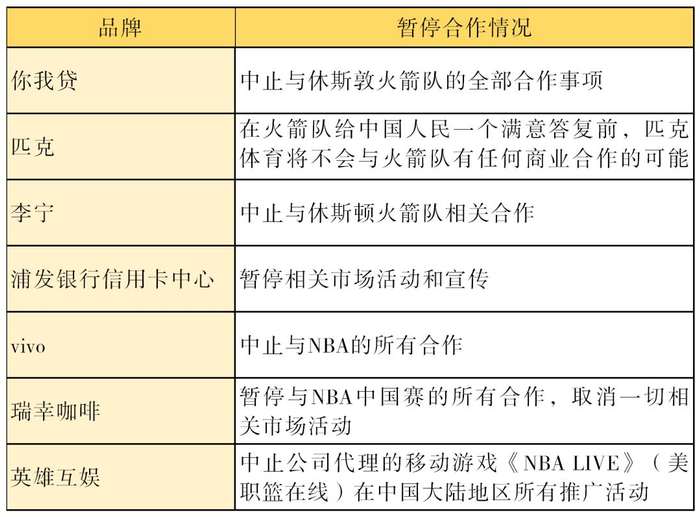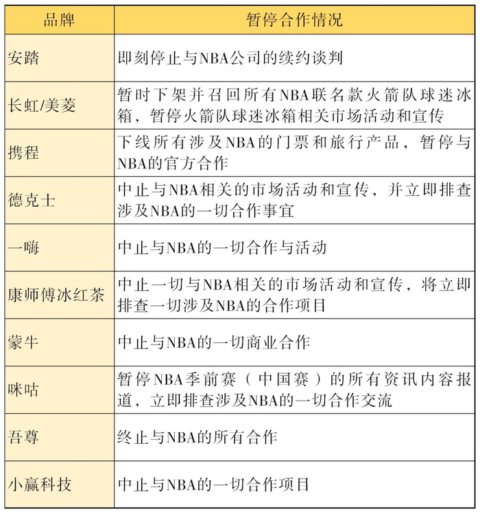 截至目前,NBA中国官网上列出的25个官方合作伙伴中,已有11个中国品牌宣布中止或暂停与NBA的合作。