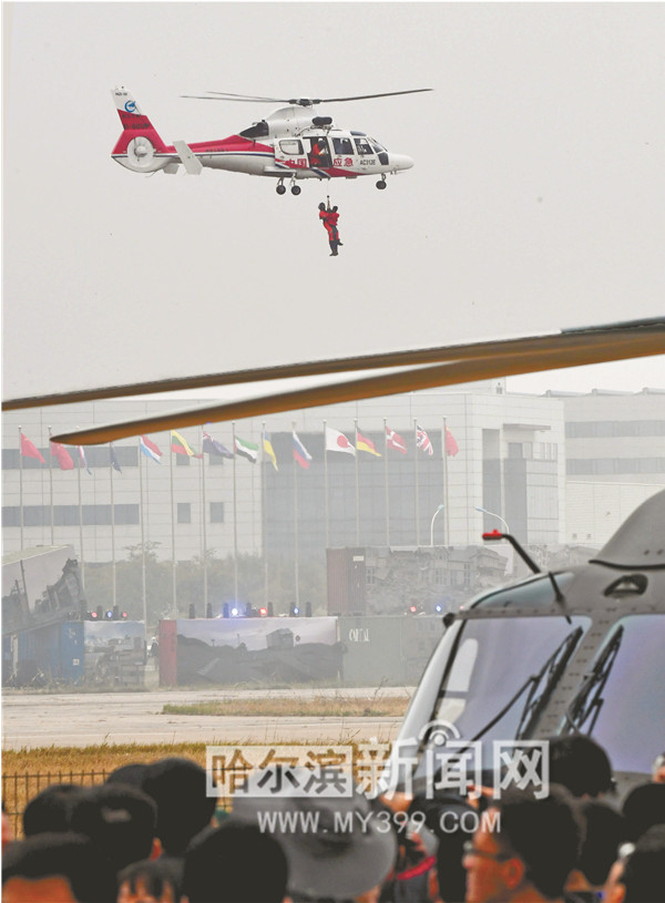 航空工业哈飞研制的AC312E首次以真机亮相展会,参加国产直升机综合应急救援演练。在万众瞩目中,AC312E直升机腾空而起,悬停于地震“残垣”和熊熊烈火之上,挂接到电动绞车吊钩上的救援人员下降到地面,将受灾群众挂接到吊钩上返回客舱,并转移到安全场所,上演了一场惊心动魄的救援大片,展示了优良的应急救援能力。未来3天,AC312E直升机还将进行5场编队飞行表演。