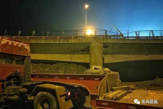 此时,被压的三辆车辆中,停放的车辆已证实为空车。其余两辆车都有人员被困,白色轿车车身直接被桥面砸中,受损最严重,黄色桥车车头被桥面砸中。