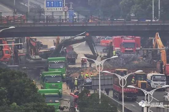 等到三辆被在桥面下的车辆完全清理出来后,现场开始对侧翻的桥面进行分段拆除。
