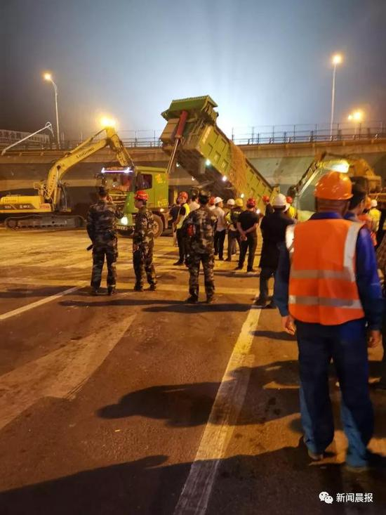 11日00:00,吊车已经到位,其实此前完成吊车的配重安装已经花去了半个小时。但吊车并没有立即启动,几辆满载着黄沙的重型土方车出现在锡港路上,它们把成吨的黄沙倾倒在侧翻的桥面下方,很快就堆出了一座小山。