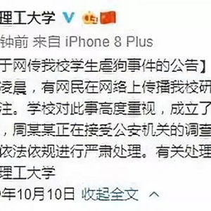 10日下午,成都理工大学官网发布了“关于网传我校学生虐狗事件的公告”,称当事人周某某正在接受公安机关的调查,学校将根据公安机关调查处理结果,依法依规进行严肃处理,处理情况将及时向社会公布。