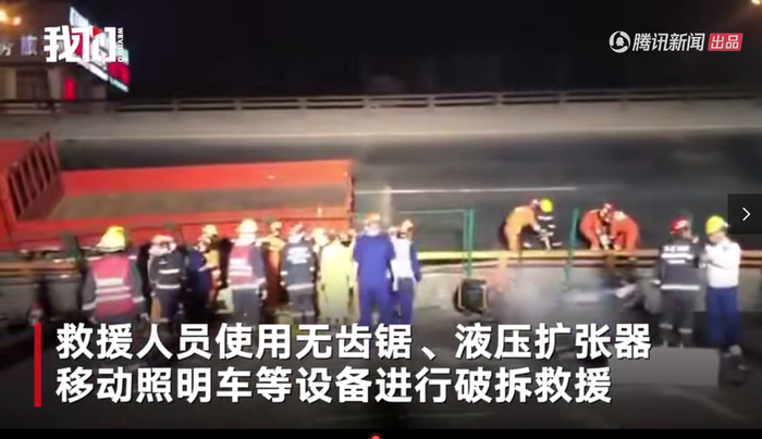 10月11日4时左右,消防人员用工具凿开一个口子,将一名被困在车内的人员抬出。随后,该人员被急救车辆运走。