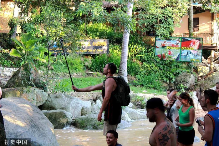 一男子在景区拿着自拍杆自拍。图/视觉中国