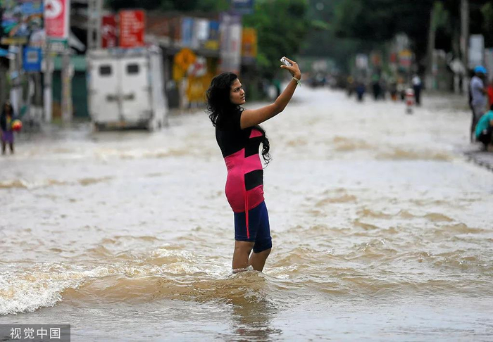 洪水中自拍。图/视觉中国