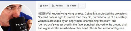 什么“对待”呢?他发现自己居然仅仅因为送马蹄露去警察局,就被暴徒们打上了“亲中”的标签,并随后在社交媒体上遭到了网络暴力、“人肉起底”乃至“死亡威胁”。