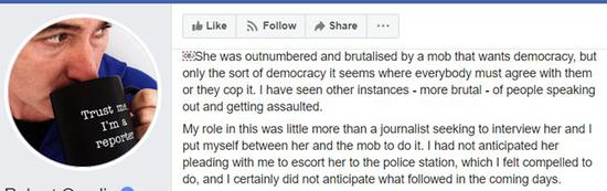 之后,这位澳大利亚主流媒体“第七频道”(Channel 7)的记者开始讲述他与被“乱港暴徒”殴打的香港艺人马蹄露相遇的过程。