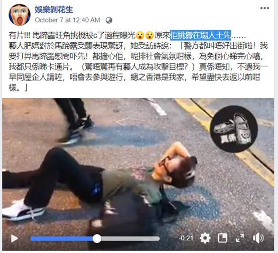 有些讽刺的是,提供这段相对完整视频的人,本身也是暴徒的支持者。而他贴出这段视频的本意是想给袭击马蹄露的暴徒“开脱”,宣称是马蹄露“挑衅”“示威者”在先。此人还辱骂马蹄露是“蓝尸”。