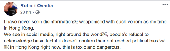 “在香港的这段时间里,我从未见过假消息能被如此歹毒地用作武器”,他说。