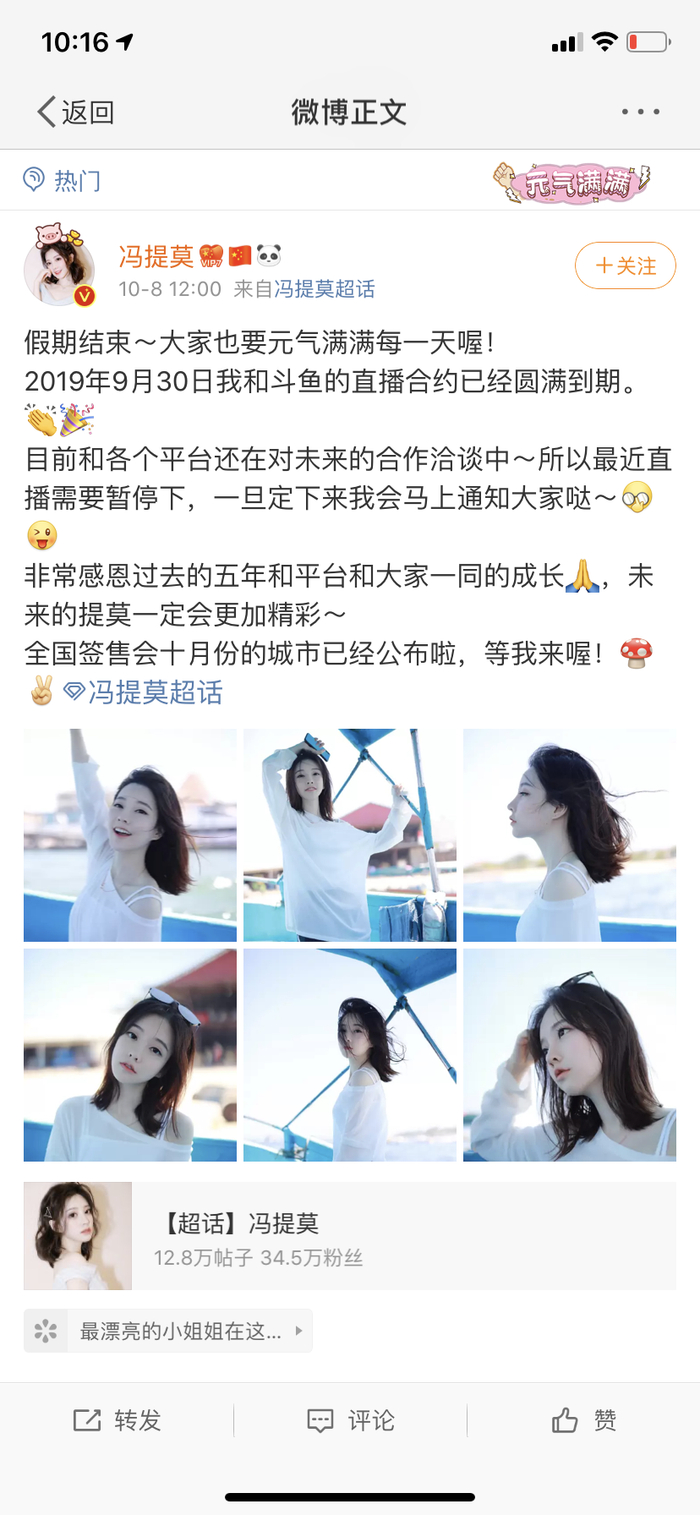 新京报讯(记者 白金蕾)10月8日,歌手、主播冯提莫在其个人微博账号称:“到2019年9月30日,我和斗鱼的直播合约已经圆满到期,和各个平台的未来合作还在洽谈中。”平淡官宣背后,也流露出网红保鲜的困境,以及主播向明星跃升的难题。