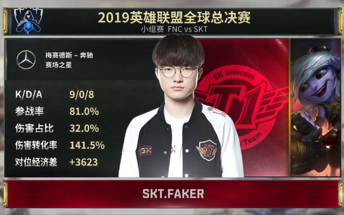 SKT一直被众战队视为劲敌,今日揭幕战中,SKT展现了超强实力,李相赫更是将小炮这名英雄使用的出神入化,最终以9杀0死8助攻,高达141.5%的伤害转换率,成功击败对手。