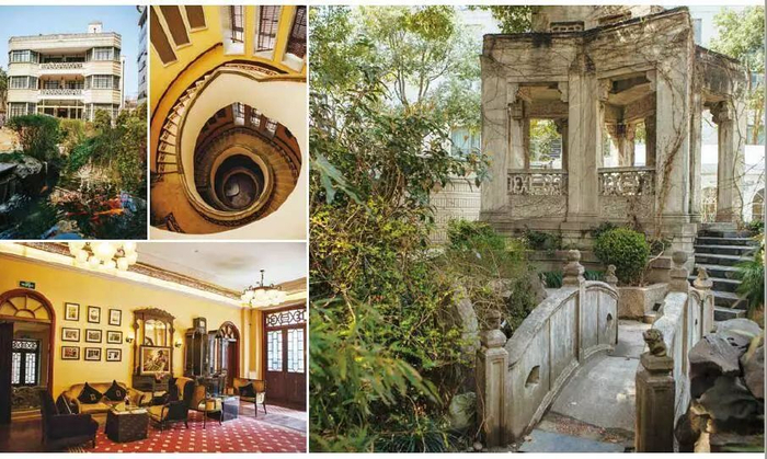 这幢钢混结构的小楼建于1934年,带有特殊的装饰艺术风格。从南入口进入,先是一个花园,其中假山、小桥、池塘、葡萄架等一应俱全,中央一座五角亭尤为特别,据说是寓意五行,而其中属金的一角正对大门。主楼为三层,酒店人员指引我从一侧“龙梯”向上参观。所谓“龙梯”是入口处雕刻的龙形装饰,楼梯从这里盘旋而上。而旁边一侧还有一部电梯,据说是上海第一部OTIS