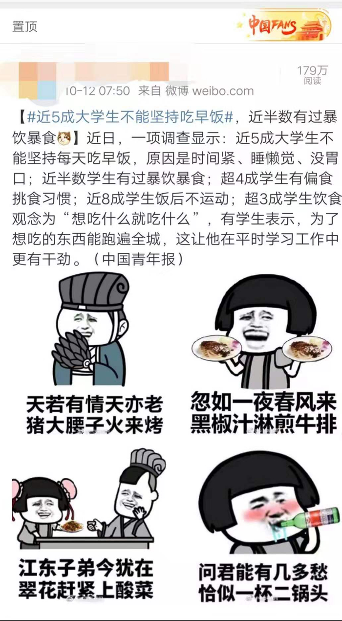 针对这项调查结果,广大网友还是买账的。网友纷纷表示,“太真实了,全都符合”“睡醒就中午了”“我能坚持不吃早饭”。大家伙也有一肚子的原因来为“不吃早饭”这种行为开脱。“我知道不吃早饭不好,但是我真的起不来,只能拥抱午后的太阳了”“你以为我抢得过那些新生吗”“大学要上早自习,上午的专业课8点开始,时间紧,来不及吃”。总而言之,就是“我太难了”