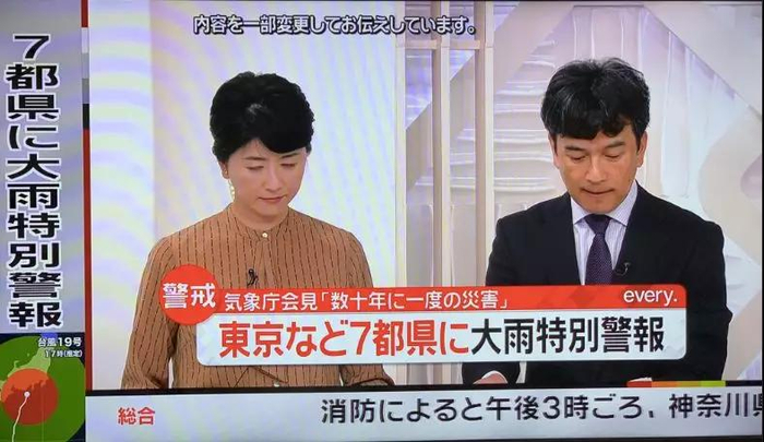 据NHK报道,12日下午3时30分,东京、埼玉、神奈川、群马、山梨、静冈、长野均发布了大雨特别警报,这是2013年启用该警报以来首次出现7个都、县同时发布的情况。