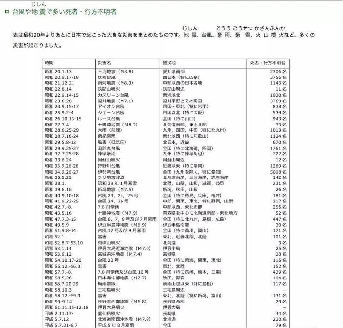 日本国土技术研究中心发布的报告指出,日本是世界上灾害高发国家之一,国土面积仅占全球的0.28%,但是6级以上地震的发生次数占全球的20.5%,灾害损失的总金额占全球的11.9%。自然灾害中,台风和地震造成的死亡人数较多。