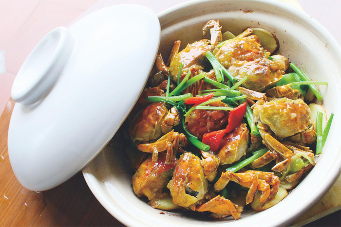 江南人爱的醉蟹,在世茂泰州茂御酒店的中餐厅有了全新演绎。选用二两半的母蟹蒸15分钟,等蟹凉了以后放入调好的醉卤里,浸泡4小时即可食用。蒸熟后的蟹肉在卤后发出淡淡的花果清香,鲜嫩甜滑。另一道胜瓜节节焗蟹煲也颇有新意,将大闸蟹洗净开四块,与广东丝瓜放进砂锅焗十分钟,再放入花雕酒,保持了大闸蟹原有的清甜口感,又融合了酒香。