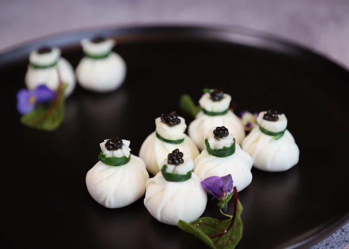 秋日的石榴诱人多汁,在南京景枫万豪酒店淮扬美食大师的手中,螃蟹与石榴居然跨界混搭了起来。鱼子酱蟹肉石榴包,嫩滑的蛋白皮包裹着新鲜的蟹肉,混合特调的酱汁,用香葱束紧,宛如一个可爱的小福袋。一口下去,黑亮晶莹的鱼子酱将蟹肉的鲜美激发,酱汁中的芥末恰好均衡了蟹肉的咸鲜,让味道更有层次。