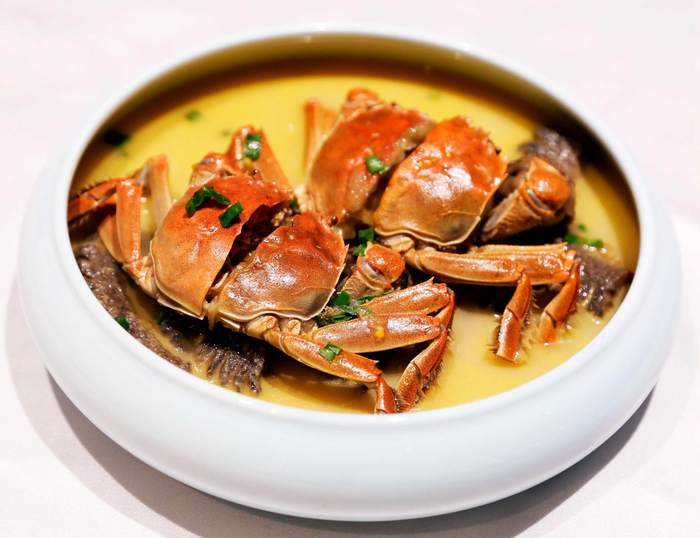 无锡太湖华邑酒店彩丰楼中餐厅可谓“近水楼台”,坐落于太湖边,能吃到最新鲜的蟹肴。其中,酥鳝炖螃蟹作为江南经典菜肴,是老苏州、无锡人对鲜味的极致追求,将新鲜捕捞的大闸蟹与黄鳝一同炖制,两种湖鲜的味觉在锅中不断碰撞、融合,令人回味无穷。蟹粉煮干丝,以扬州精致白干切丝,搭配现蒸现取的大闸蟹膏肉,一同入老母鸡汤烹煮,混合三种不同鲜味的菜品,入口细腻丝滑。