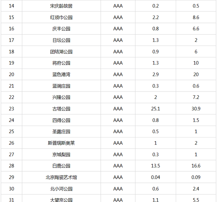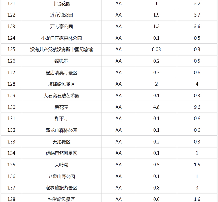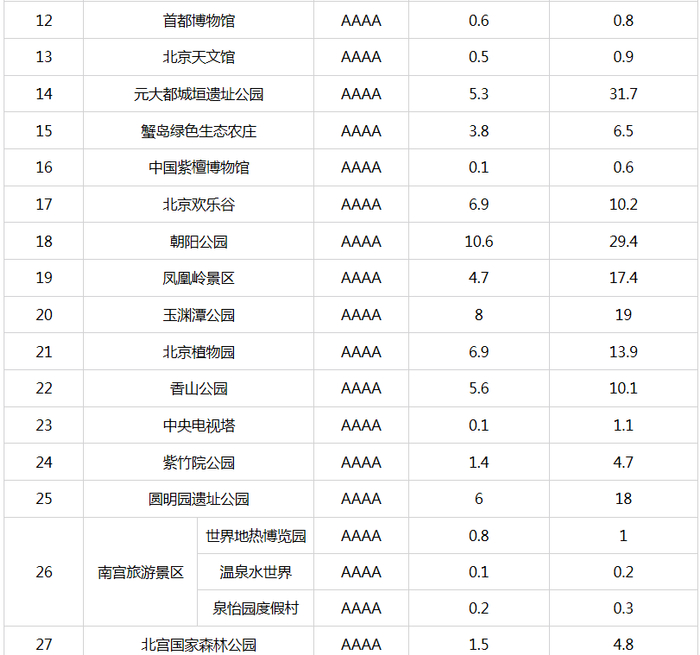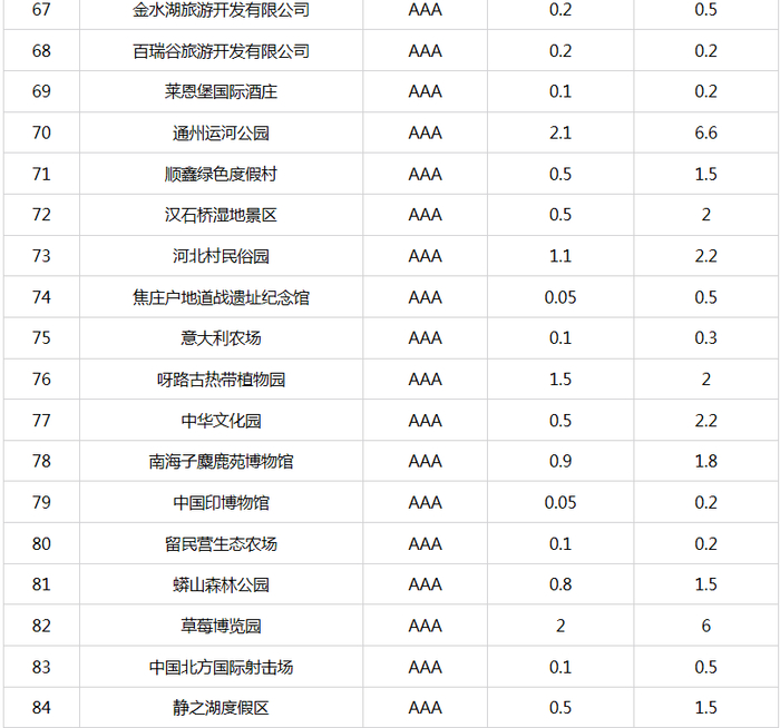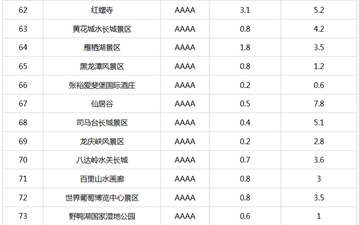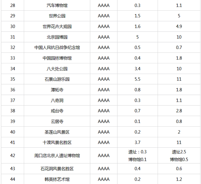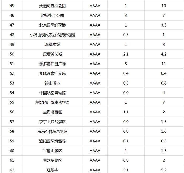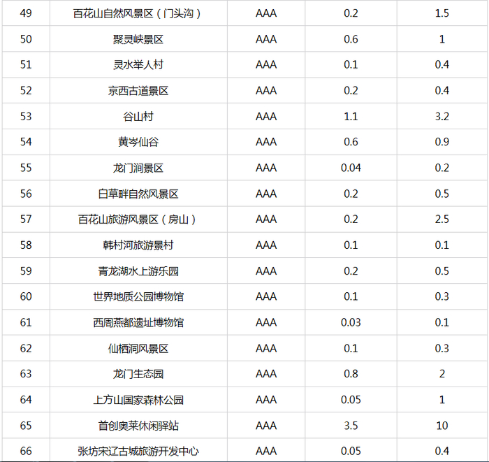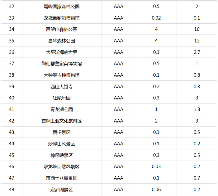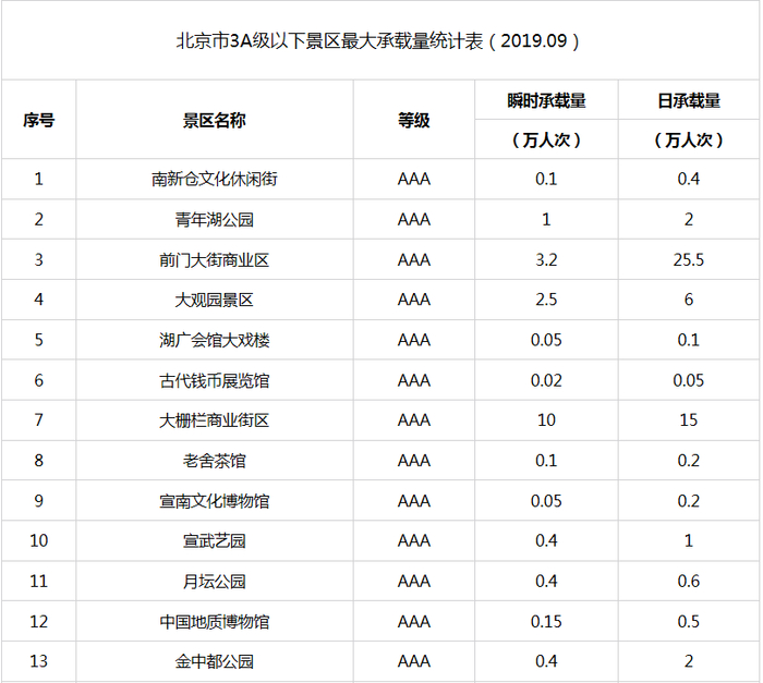 新京报快讯 据北京市文化和旅游局官网消息,自2015年9月北京市公布A级旅游景区最大承载量以来,景区最大承载量成为本市加强景区客流监管、保障景区游客不“超载”的有效“调控器”,对保障游客的人身安全,提高游客满意度,加强景区的资源保护起到了积极的推动作用。为适应本市旅游业的快速发展,确保景区最大承载量的准确性、科学性以及与景区管理高度结合性,近期,市文化和旅游局督导各A级旅游景区对景区最大承载量(包括瞬时承载量和日承载量)进行了重新测算、核定。现对重新核定的4A级以下旅游景区最大承载量予以公布(见附表)。