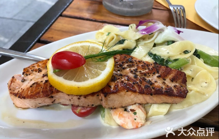 三文鱼刺身好吃,但也并不是所有人都能接受生吃,扒三文鱼这种熟吃的做法也受到很多人的喜爱。申德勒的扒三文鱼煎得恰到好处,底下配的是意式宽面,再搭配浓厚的奶油蘑菇酱,温暖香醇的感觉十分适合现在的天气。不过要趁热吃,凉了之后还是会有些许的油腻感。
