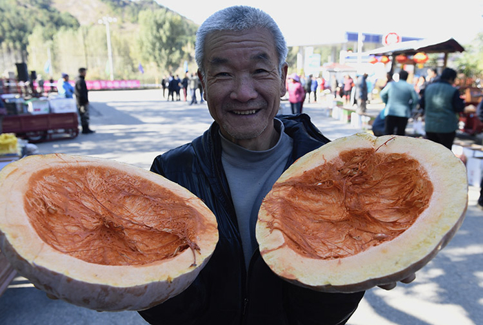 密云农产品资源丰富,种植户切开成熟的大南瓜。