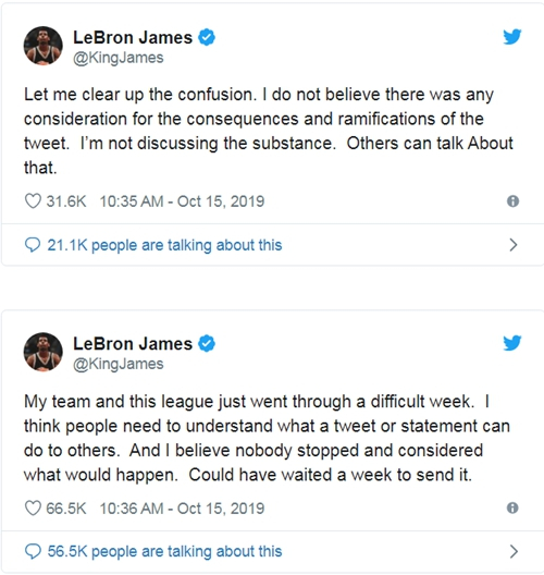 詹姆斯在推特中写道,“让我澄清困惑,我不相信(有人)考虑过这条推特会造成的后果及影响。我不是在讨论实质内容,其他人可以谈论这个。”他又表示,“我的球队和这个联盟(NBA)刚刚度过了艰难的一周,我认为人们需要明白一条推特或者一份声明会对他人产生什么样的影响。我也相信没有人停下来思考会发生什么。本可以等一周再发这个的”。