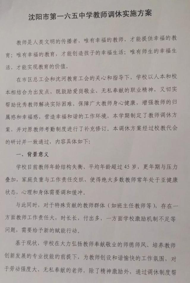 金至涛介绍,为了让调休方案起到有效的激励效果,沈阳第一六五学校的36名教职工代表经过充分调研和讨论,在各方面的权衡之下,形成了先在班主任等艰苦岗位,试行每月调休两次、每次半天事假,再根据具体情况推广至全体教职工,经校代会商讨通过后,在全校大会上,向全体教师公布。
