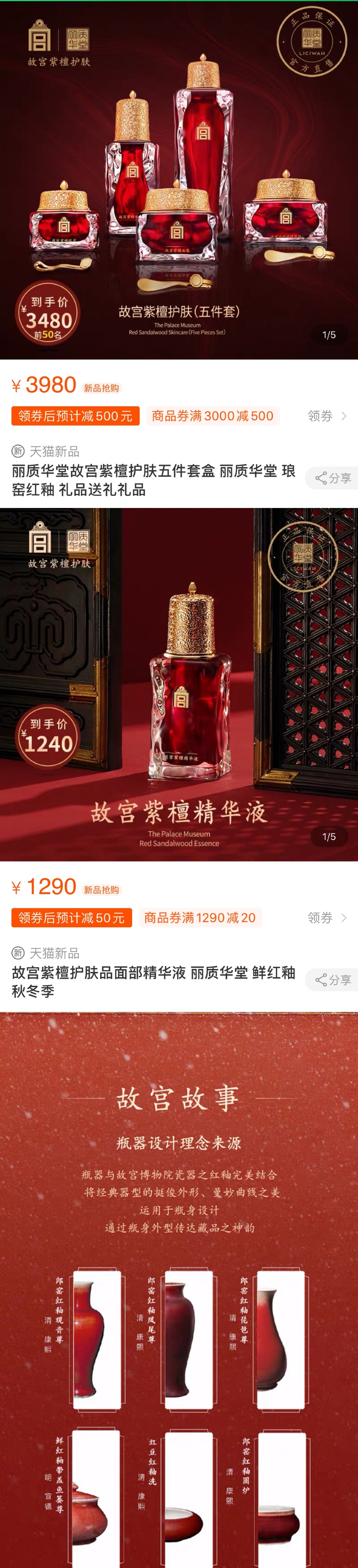记者昨天在一家名为“丽质华堂”的护肤品天猫旗舰店上看到,这套名为“丽质华堂故宫紫檀护肤”的五件套套盒标价3980元,其中包括柔肤水、精华液、眼霜、面霜、睡眠面膜。商品介绍中说,这套护肤品的瓶器设计理念来源于“故宫博物院瓷器之红釉”,各种细节设计来源于传统梅瓶瓶盖、海水江崖纹种的祥云、如意等,更是将“紫檀精华”融入护肤品中。除了套装,各种单品也价格不菲,比如面部精华液1290元,面霜990元,睡眠面膜890元。与之前的故宫彩妆一经推出就遭遇“疯抢”相比,这套护肤品的销售比较“冷清”,购买者数量目前只有个位数。