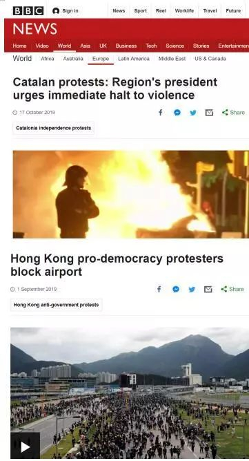 然而,不少西方媒体对香港和加泰罗尼亚的骚乱,表现出了大相径庭的态度:在BBC今天的报道中,其标题用了“呼吁制止暴力”,把加泰罗尼亚抗议者的行动定义为“暴乱”、“暴力”。而在其9月1日的报道中,BBC对香港围堵机场的极端行为,却称其为“支持民主”。