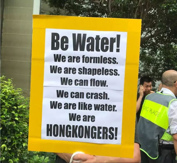在香港暴乱的持续过程中,在推特上有人归纳出了所谓的“香港经验”,建议抗议者避免与警察正面相遇,“像水一样(Be Water)”的灵活分散地行动。