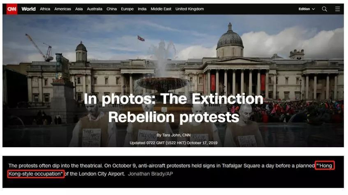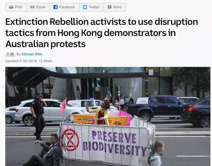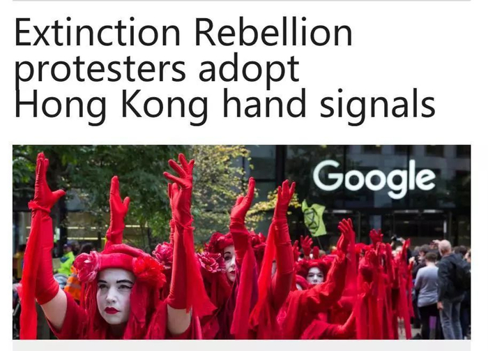 CNN、澳大利亚ABC、英国泰晤士报等媒体承认,“反抗灭绝”的激进行动,就是学习了香港的“香港式占领”。