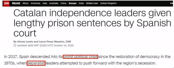 美国CNN于10月14日对加泰罗尼亚的报道里,也将当地事态称为“西班牙最严重的政治危机”,称独立倡议者为“分裂主义者”。