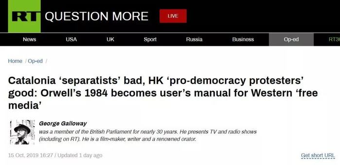 对部分西方媒体的这些表现,“今日俄罗斯”电视台网站在10月15日的评论文章标题里一针见血的讽刺道:“加泰罗尼亚‘分裂分子’是坏的,香港‘支持民主的抗议者’是好的:乔治·奥威尔的《1984》,成了西方‘自由媒体’的说明书”。