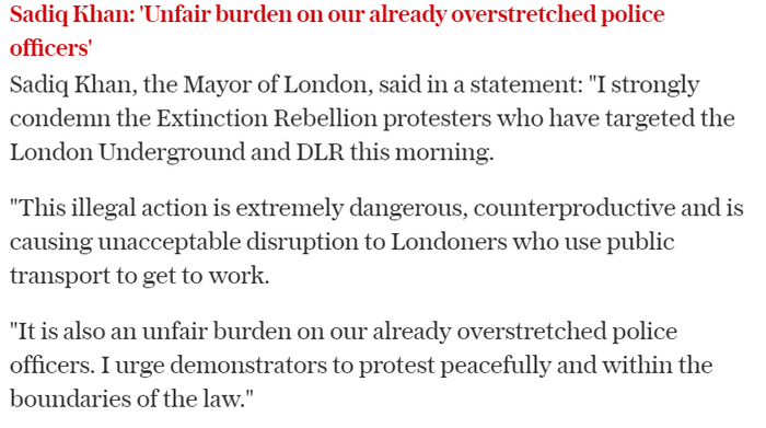 “我强烈谴责‘反抗灭绝’示威者今日早晨针对伦敦地铁和轻轨的抗议活动,这一违法行为极度危险、对社会无益,且给使用公共交通上班的伦敦市民带来了不能接受的扰乱。”