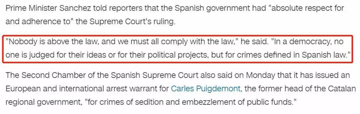 在谈到对加泰罗尼亚独立领袖的判决时,CNN还引用了西班牙首相桑切斯“依法行事”描述:“无人可以置身于法律之上,我们必须依法行事”“在民主里,没人会因政治理念和政治方案而被裁决,但却会因触犯西班牙法律而被定罪。”