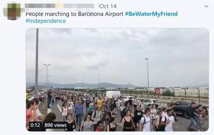 法国24电视台10月15日就报道称,当天有约1万名独立运动支持者包围了巴塞罗那机场,并喊出口号“将加泰罗尼亚变成新的香港”。