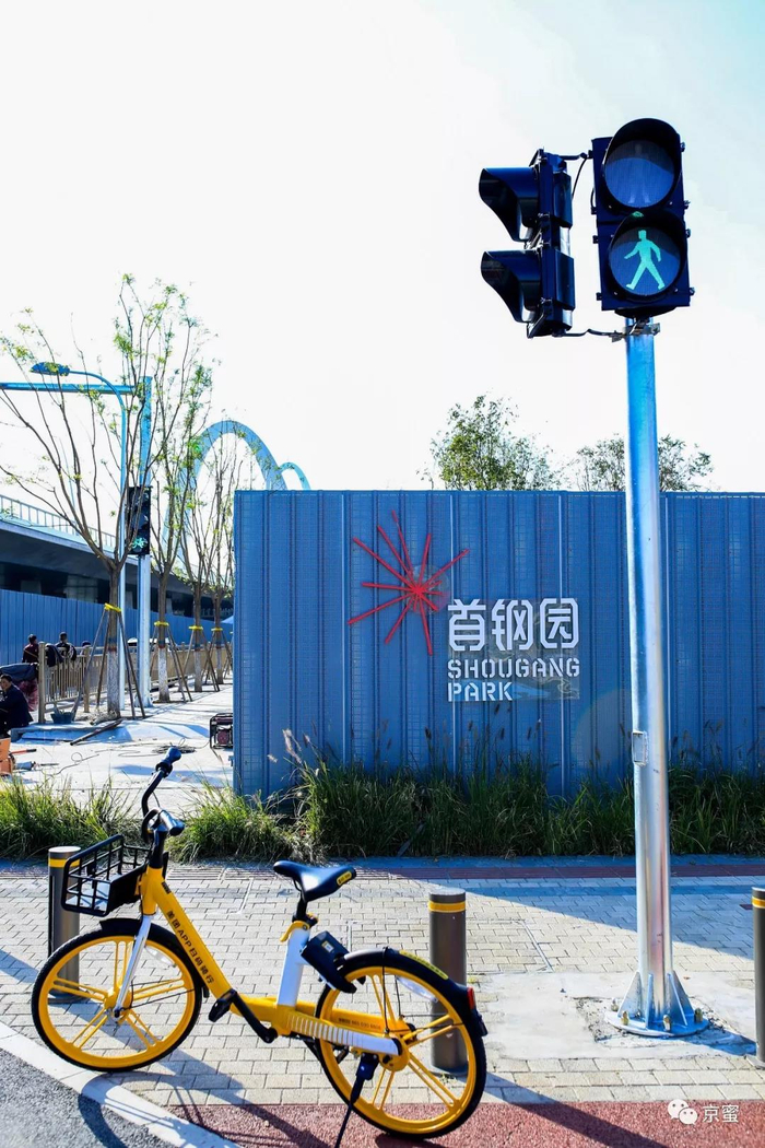 如果是乘坐地铁1号线在古城站下车,那么京蜜建议你骑一辆共享单车一路西行3公里,一直骑到距离新首钢大桥最近的红绿灯路口,就到达了群明湖大街南口的位置。园区面积很大,骑自行车游览是最便捷的方式。