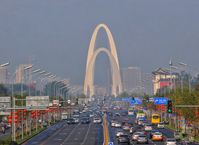 新首钢大桥横跨永定河,全长1.35千米,是北京地区最大跨径桥梁。这座目前我国桥梁中最宽的钢桥梁,建桥用了3年时间,有3.5米宽的非机动车道和3米宽的人行步道,相当舒适和宽敞。天色一暗,桥上的灯光也亮了。两座寓意“合力之门”的钢塔一高一矮,在大桥两端变换着色彩。