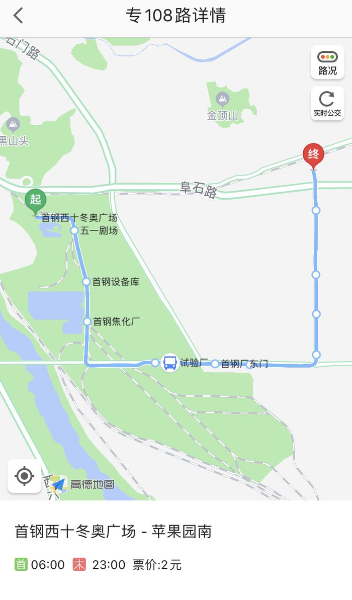 值得一提的是,首钢园区内还设有一条公交线路——专108路。起始站位于秀池北路的首钢西十冬奥广场,一路向南,经五一剧场、首钢焦化厂,再往东由首钢厂东门驶离园区。不过需要注意的是,这班车的等待时间较久,大约20分钟来一趟车。