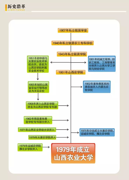 中华人民共和国成立后,铭贤学院于1950年11月迁返山西太谷原铭贤学堂旧址。1951年10月1日,山西省人民政府接管了铭贤学院,改私立为公办,正式成立山西农学院。1971年山西农业劳动大学归并该院。1975年在昔阳、雁北、运城组建了3个分院,分别为大寨、雁北、运城农学院。1979年7月27日,经国务院批准大寨农学院并入山西农学院,同年山西农学院更名为山西农业大学,被列为全国重点高等学校。此后,山西省人民政府批准撤销雁北、运城农学院,将其并入山西农业大学。