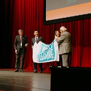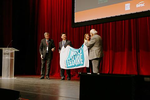 新京报讯(记者 郑艺佳)当地时间2018年8月31日晚,在巴西圣保罗举办的第十五届世界休闲大会宣布正式闭幕。闭幕式上,举办了“2020年北京·平谷世界休闲大会中国邀约”活动。本届巴西世界休闲大会承办方SESC集团总裁Danilo Miranda先生向2020北京·平谷世界休闲大会执委会办公室副主任、北京市平谷区副区长王晓东移交了世界休闲组织会旗,标志着世界休闲大会正式进入北京时间。