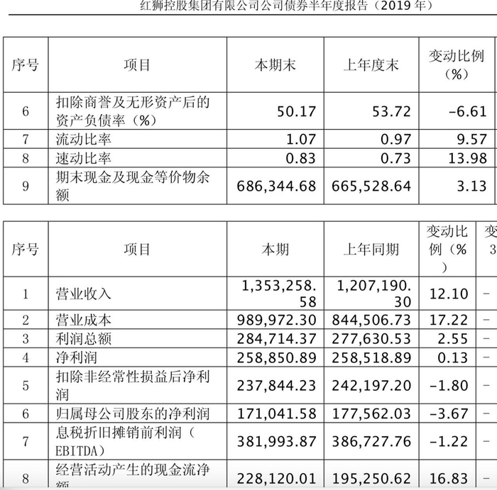 新京报记者获悉,2019年上半年,红狮集团总负债为197.98亿元,按照总资产430.24亿元计算,红狮集团负债率在46%左右。